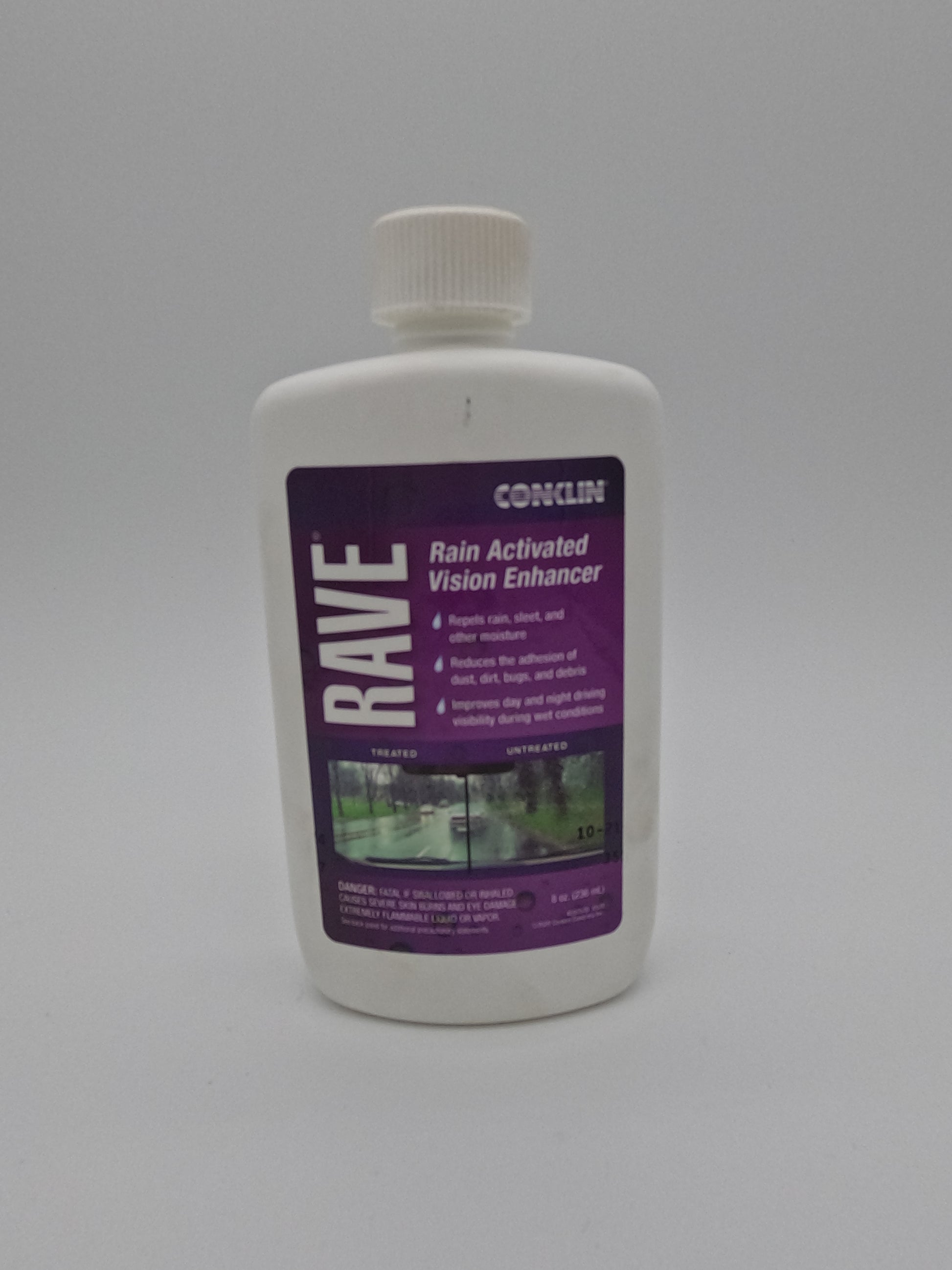 Rave glass treatment forms a clear film that repels and disperses water on contact.